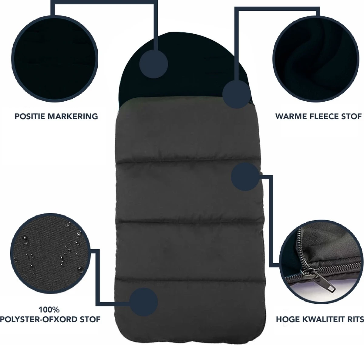 De buitenkant van de voetenzak is gemaakt van waterafstotend materiaal en de binnenkant is gevoerd met een heerlijk zachte teddy fleece stof voor extra warmte en comfort. Dit maakt de voetenzak niet alleen waterbestendig, maar ook winddicht – dubbel profiteren dus!