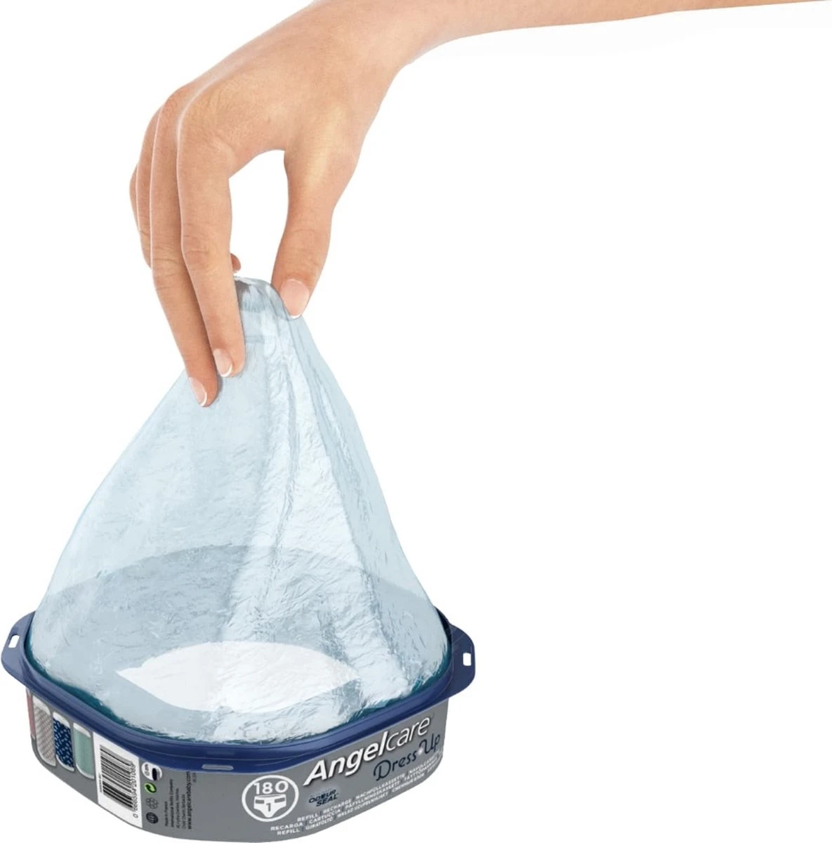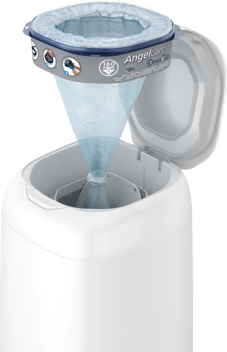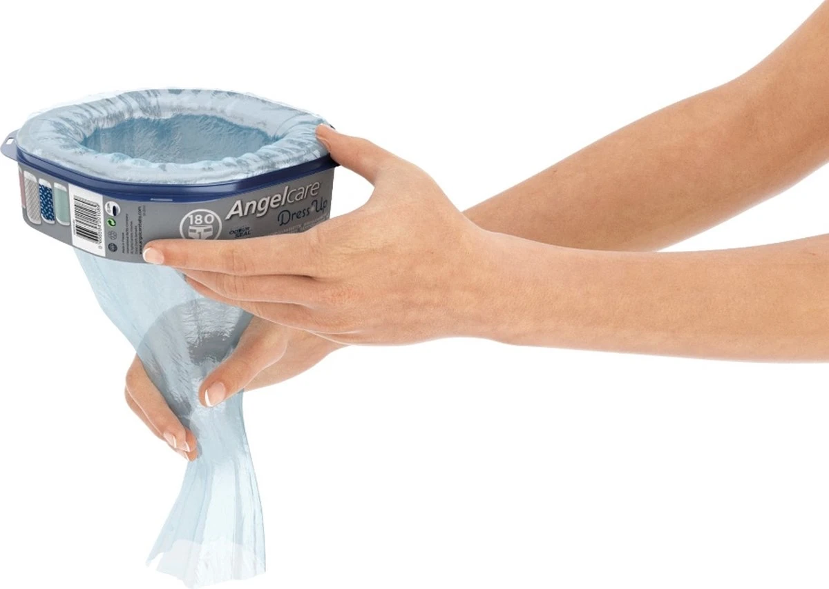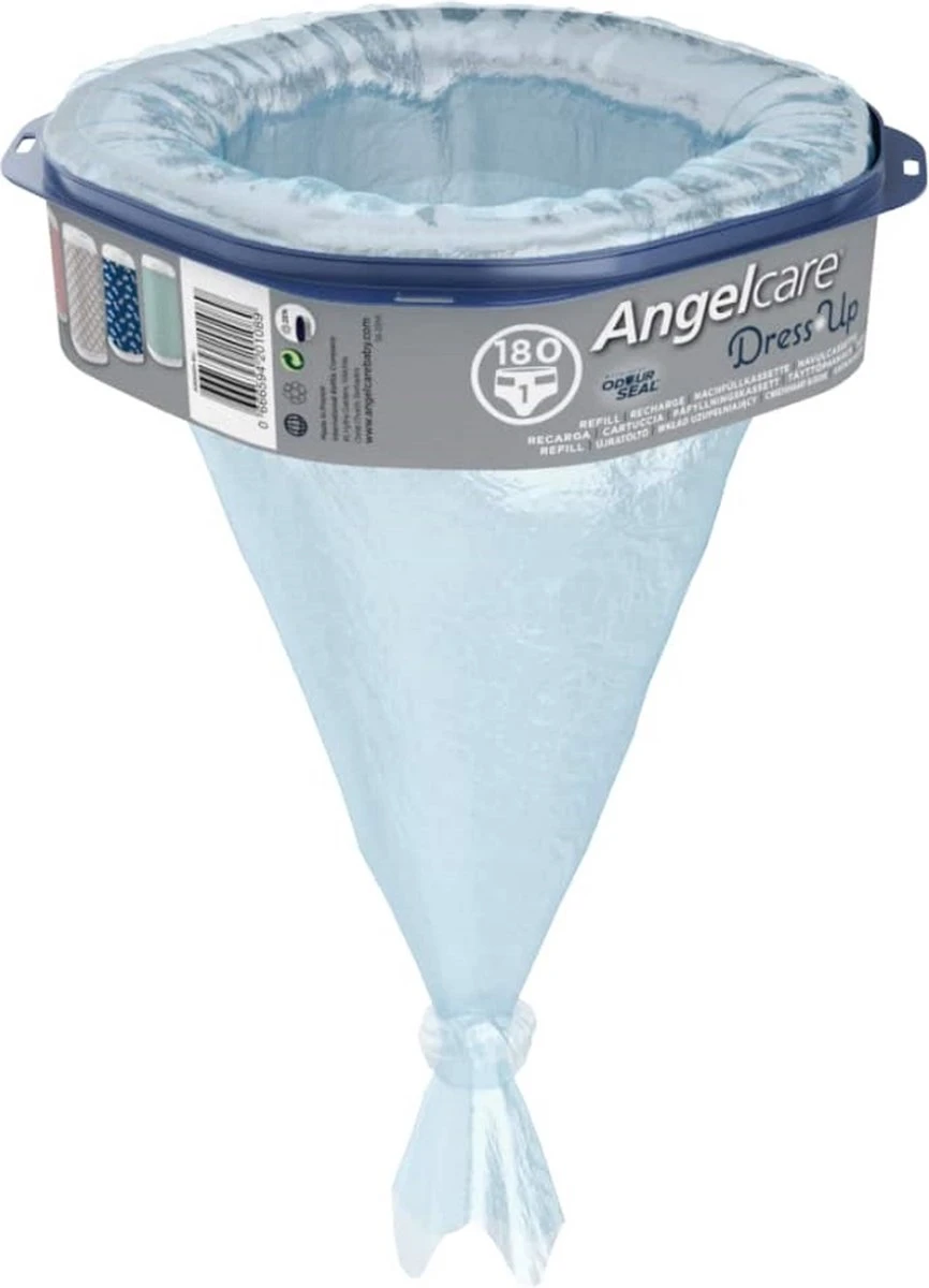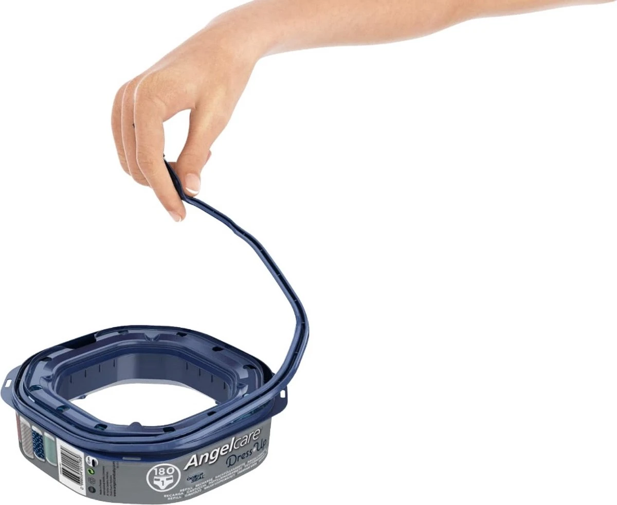 De Angelcare® navullingcartridges gaan langer mee en verbruiken veel minder film. De luiers worden niet afzonderlijk in de film geschroefd, maar in een stuk slang verzameld. Dit is vriendelijker voor het milieu omdat het aanzienlijk minder film verbruikt. 1 Angelcare® navulcassette Dress-Up is voldoende voor ongeveer 180 luiers!!