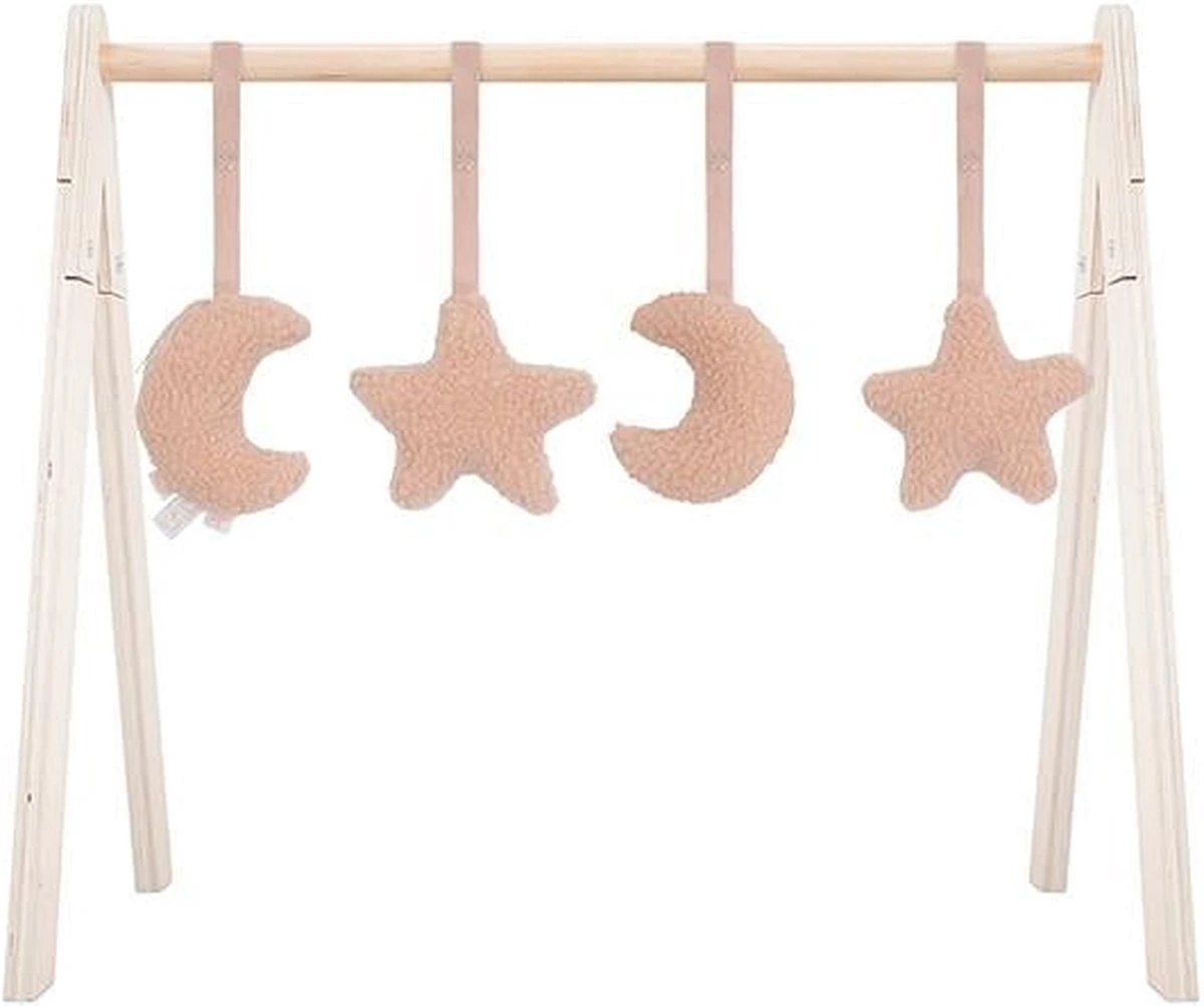 Deze vier speelfiguurtjes zijn geschikt voor gebruik in combinatie met de Jollein houten babygym. Het is van zachte teddystof in roze, nougat of groen. Vanaf ongeveer 10 weken krijgt je baby steeds meer behoefte aan prikkels, spelen en rondkijken. Dat is het moment dat een babygym die extra uitdaging biedt. Haal gauw de houten babygym in huis en versier deze met deze leuke figuurtjes in de vorm van twee maantjes en twee sterren. Leg je baby er onder op een zachte ondergrond en het spelen kan beginnen! De bewegingen van de speeltjes aan de babygym vindt je baby fascinerend om te zien. Hij zal enthousiast met zijn voetjes trappelen of geluidjes gaan maken als hij een speeltje weet te grijpen of aan te tikken zodat het nog meer gaat bewegen. Het gebruik van de babygym stimuleert de ontwikkeling van de grove en fijne motoriek. Het prikkelt de zintuigen. Bovendien krijgt je baby steeds meer controle over zijn grijptechnieken en het leert dat speeltjes meer gaan bewegen als je er tegen aan tikt of speeltjes vastgrijpt. Heel waardevol dus, zo’n babygym. De babygymspeeltjes van Jollein worden exclusief de houten babygym geleverd. De babygym is los verkrijgbaar en gemakkelijk in elkaar te zetten. In de Jollein collectie zijn meerdere bijpassende babygymspeeltjes verkrijgbaar. Je kunt de babyspeeltjes makkelijk bevestigen en weer verwijderen. Daardoor kun je afwisselen met de speeltjes en blijft het voor je baby interessant en uitdagend.