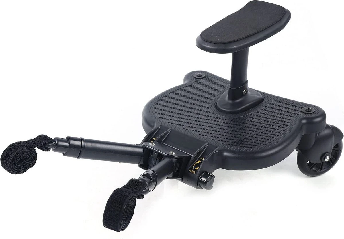 Door de klitteband verbinding past de meerijdplank op iedere buggy en kinderwagen. Ook heeft het meerijdplankje een zitje.