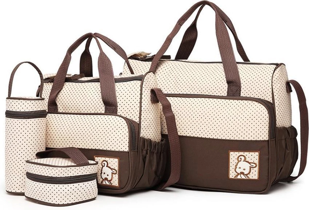 Deze complete Miss Lulu luiertas set is ideaal voor onderweg. Een compacte en functionele set met een 2 verschillende formaten luiertassen inclusief verschoonmatje voor je baby en een tasje voor de fles en het eten. Deze complete, betaalbare luiertas set mag niet ontbreken in je baby uitzet! Met 5 verschillende tassen is de verzorgingstas gemakkelijk te organiseren, super handig in gebruik en biedt werkelijk een zee van ruimte. Denk aan luiers, flesjes, babyvoeding, speentjes, slabbetjes en rompertjes, voor werkelijk alles is een plekje. De 5-delige set is gemaakt van hoogwaardig waterafstotend polyester, heeft een stijlvol design en gaat de gehele luiertijd mee! Of je nou boodschappen gaat doen, op een speelafspraakje gaat of een dagje weg; deze veelzijdige tas komt altijd van pas!