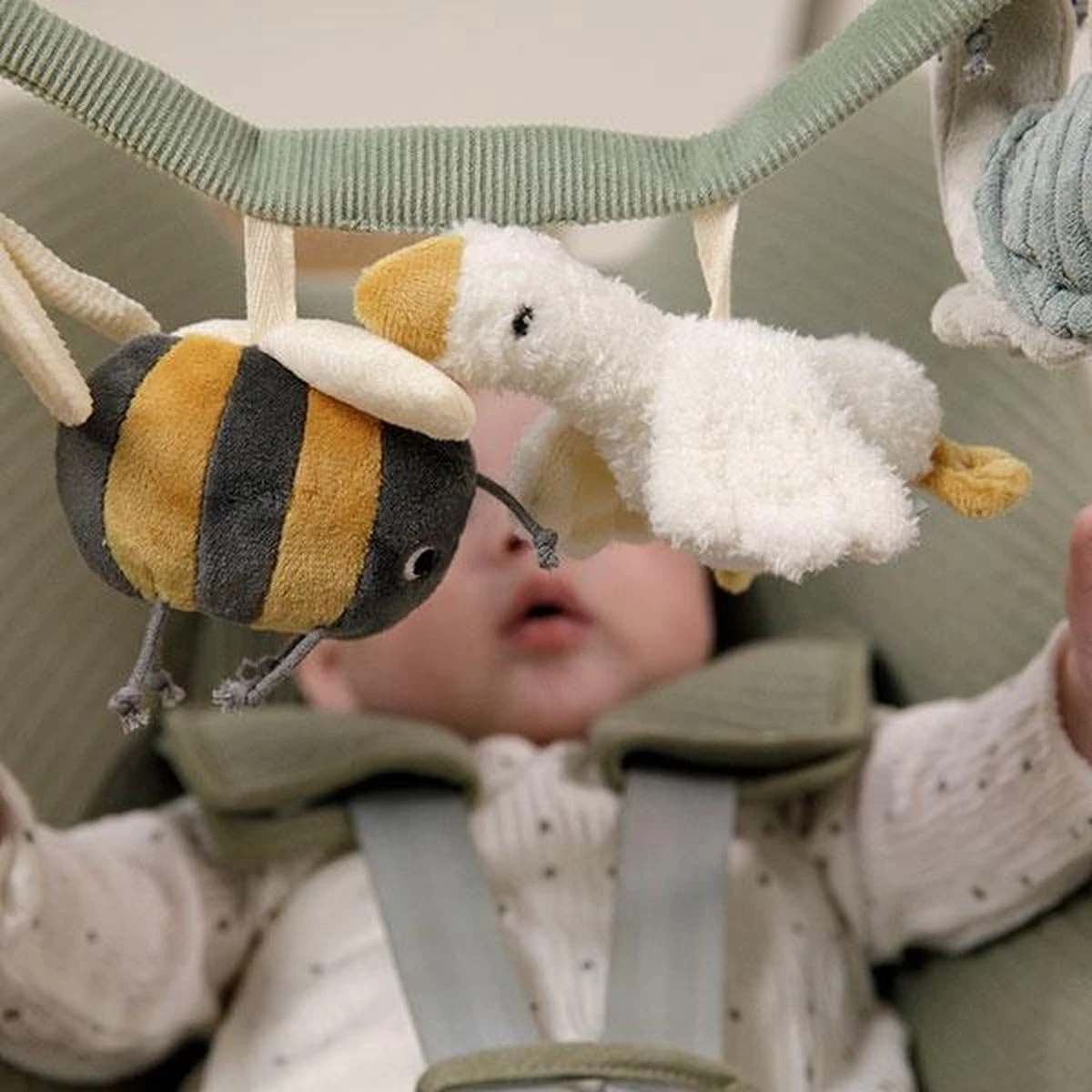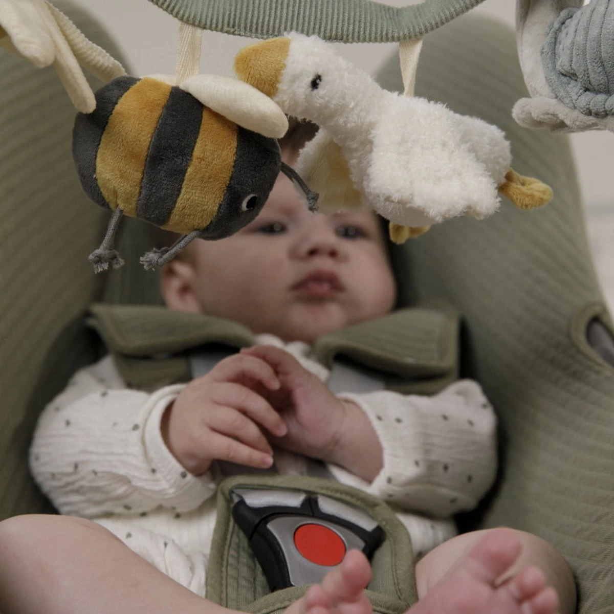 Wagenspanner Little Goose is eenvoudig te bevestigen aan een autostoeltje of kinderwagen en zorgt onderweg voor veel speelplezier. De wagenspanner heeft 4 speeltjes: een rammelaar, spiegeltje, knijptoetertje en knisperspeeltje, die de hand-oogcoördinatie stimuleren.